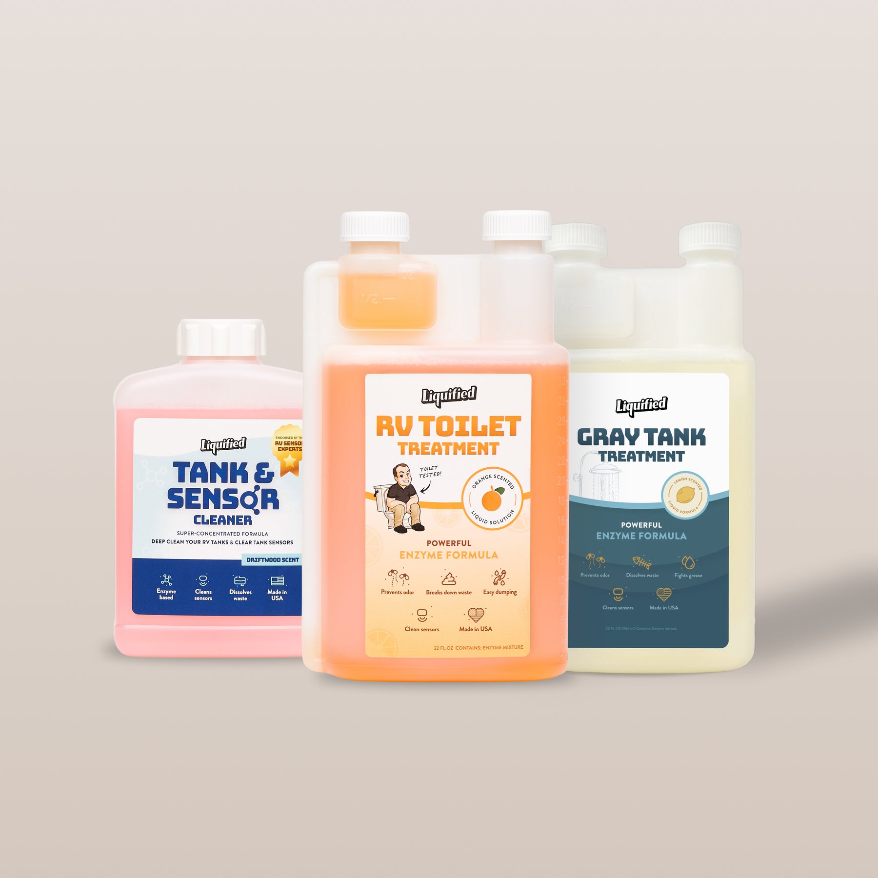 • RV Black Tank Treatment (Orange Scent) – Breaks down waste and toilet paper while controlling odors in the black tank. The powerful liquid formula helps keep sensors cleaner and tanks functioning properly.